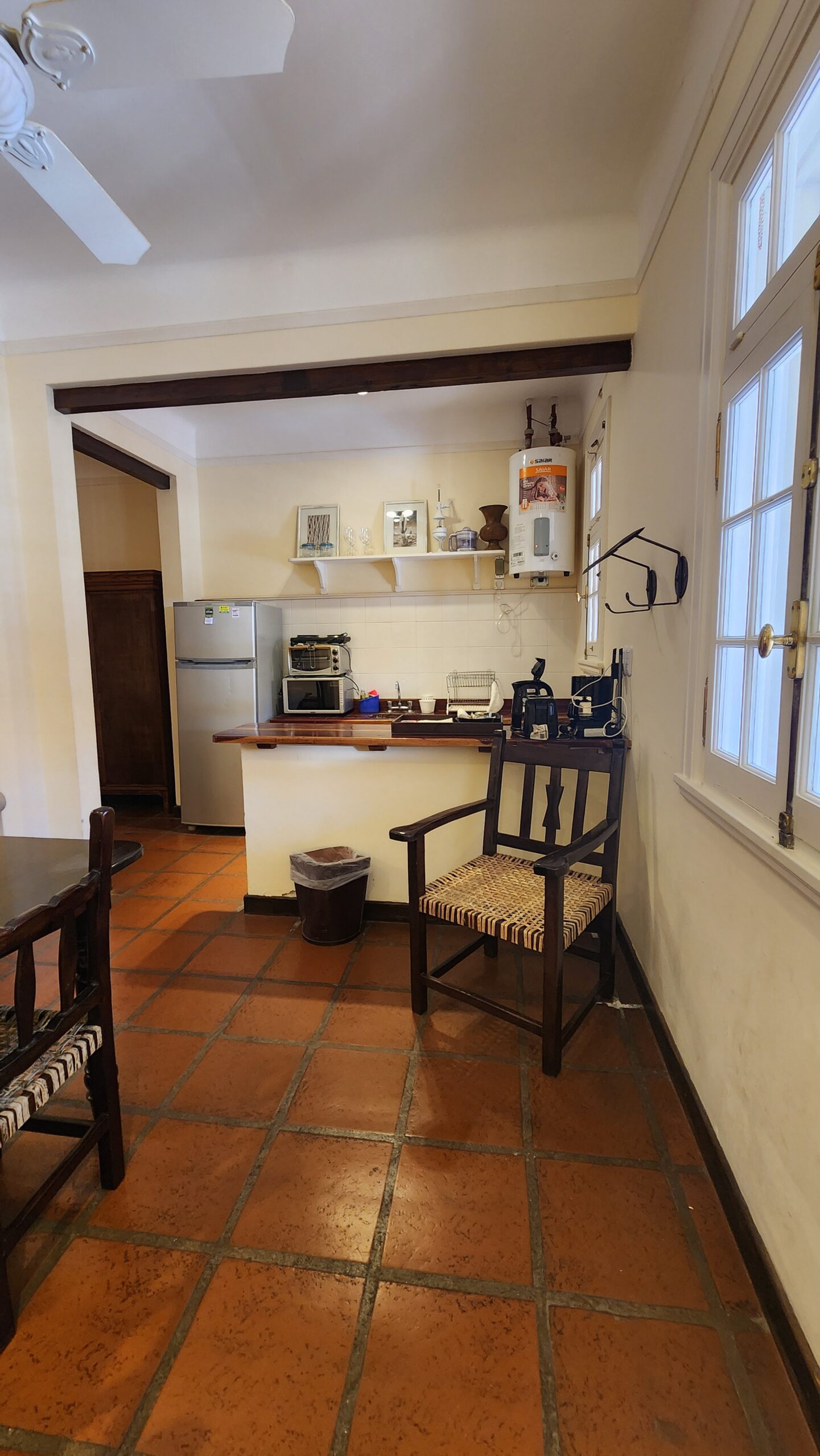 Heladera con freezer, horno eléctrico pequeño, microondas, pava eléctrica, anafe de dos hornallas, tostadora y cafetera de filtro.