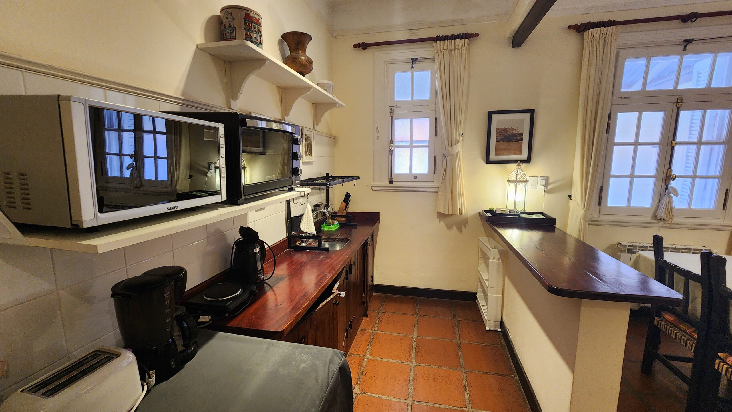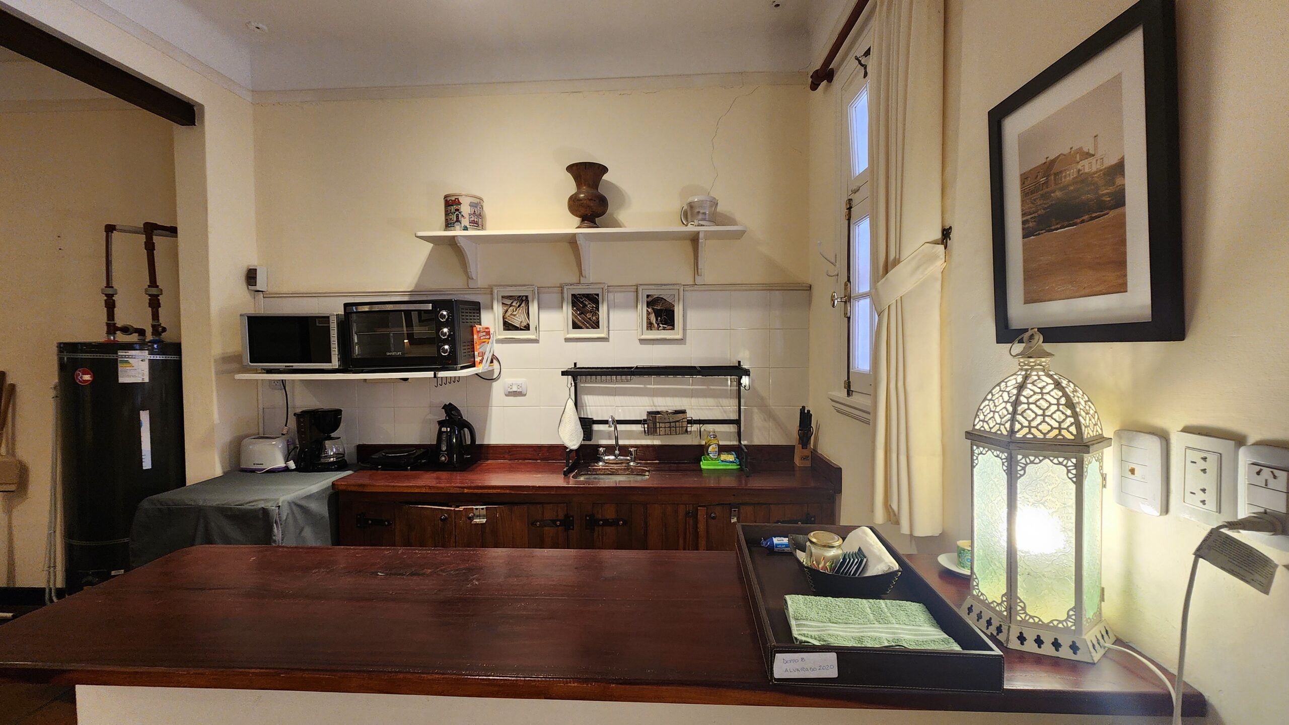 Dispone de anafe simple, heladera con freezer, cafetera, horno eléctrico, tostadora y pava eléctrica.